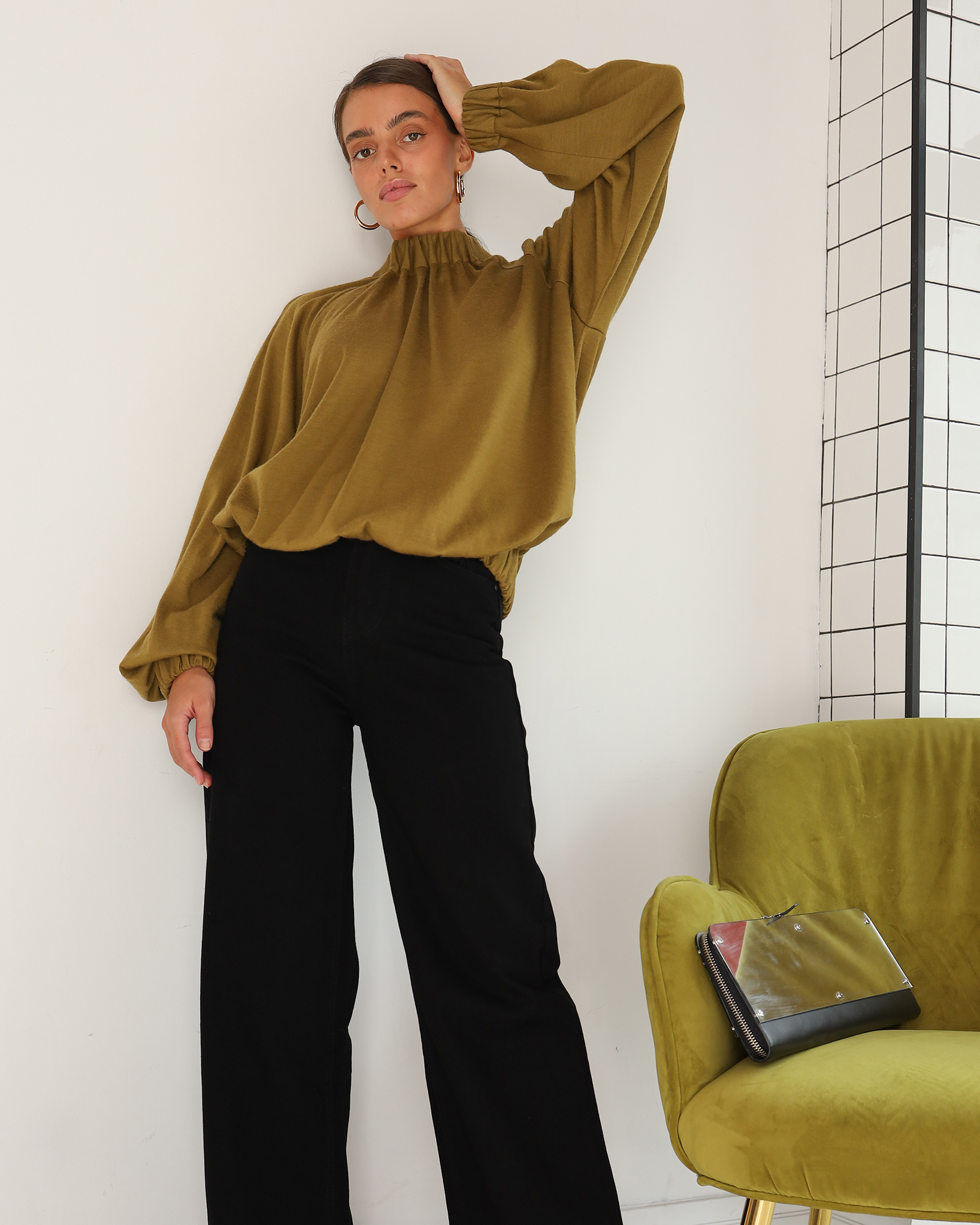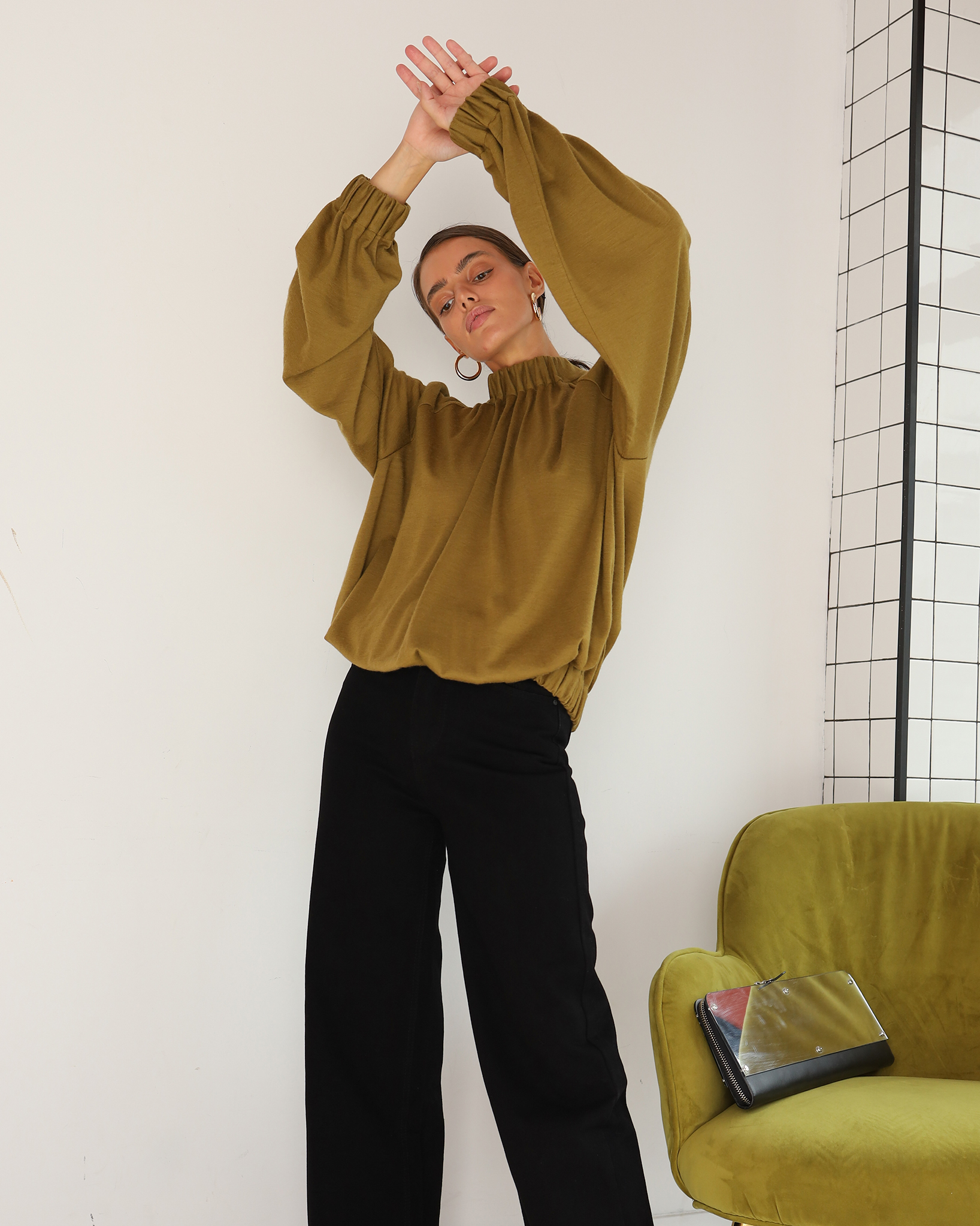 Уютная, теплая и элегантная блуза свободного силуэта из 100% шерсти.