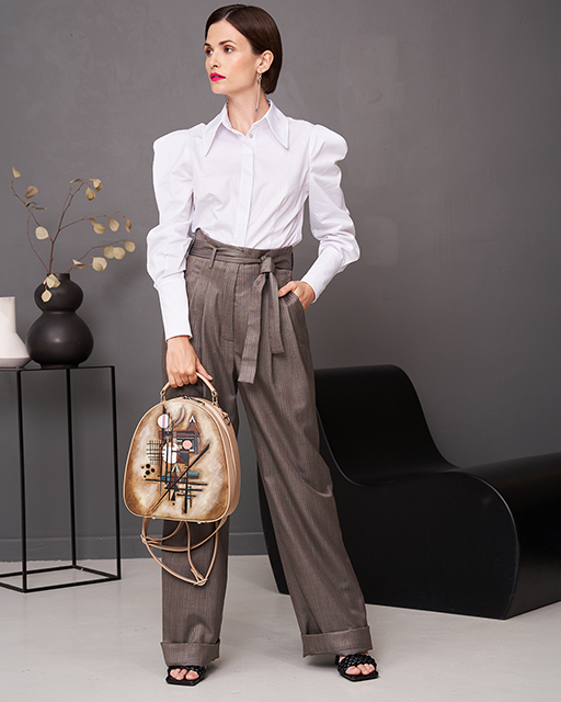 Высокий манжет, широкий акцентный рукав «от плеча», перламутровые кнопки, тонированные в цвет ткани, и удлиненный воротничок - реверанс романтизму. Металлические пуговицы-«палочки» добавляют структурный акцент на манжеты. Большое содержание хлопка в ткани рубашки делает ее комфортной, а синтетические волокна позволяют изделию прослужить дольше.